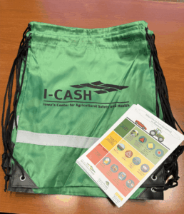 For our fall campaign, I-CASH distributed a resource from our partners at the Great Plains Center for Agricultural Health showing ASABE lighting and marking guidelines and safety guidelines to follow when driving farm equipment on roadways. In addition, we provided drawstring bags with a reflective strip sewn in.